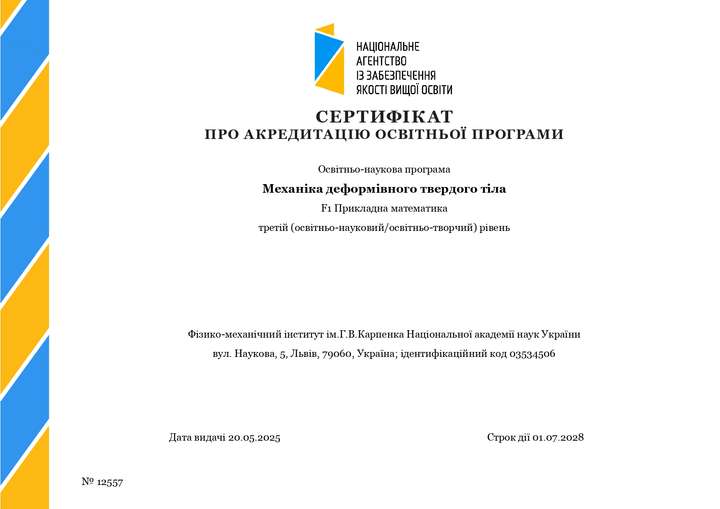 – F1 «Прикладна математика» (сертифікат про акредитацію ОНП «Механіка деформівного твердого тіла» № 12557, строк його дії до 01.07.2028) галузь знань F Інформаційні технології;