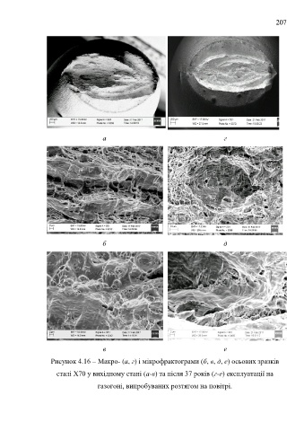 207 а г б д в е Рисунок 4.16 – Макро- (а, г) і мікрофрактограми (б, в, д, е) осьових зразків сталі Х70 у вихідному стані (а-в) та після 37 років (г-е) експлуатації на газогоні, випробуваних розтягом на повітрі.