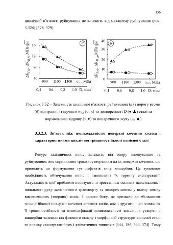 (б) від границі текучості (○, ) та дисперсності D (●,▲) сталі за