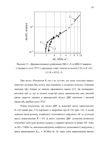 R = 0,9 інший (рис. 5.5), порівняно із випробами при R = 0,1 (рис. 5.4). А малий