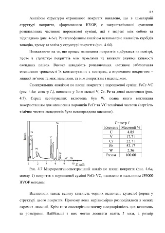 (рис. 4.6а, спектр 1,), виявлено у його складі V, Cr, Fe та деякі включення (рис.