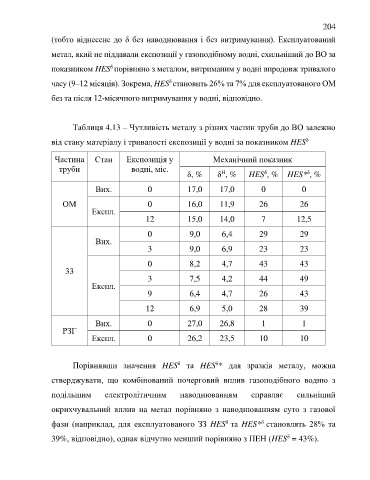 Таблиця 4.13 – Чутливість металу з різних частин труби до ВО залежно