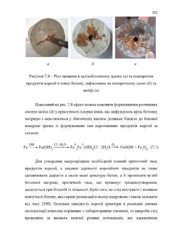 продуктів корозії в товщі бетону, зафіксоване на поперечному зломі (б) та