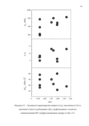 181 Рисунок 4.3 – Залежності характеристик міцності ( ), пластичності () та B циклічної в’язкості руйнування (K ) графітизованих сталей від fc співвідношення Si/C (цифри вдповідають намеру в табл. 4.1)