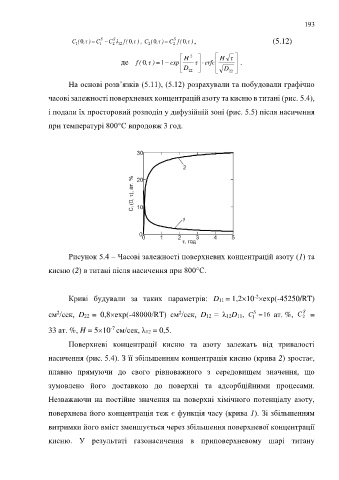 часові залежності поверхневих концентрацій азоту та кисню в титані (рис. 5.4),