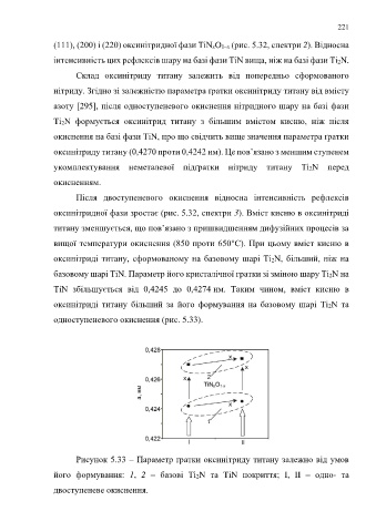 (111), (200) і (220) оксинітридної фази TiNxO1–x (рис. 5.32, спектри 2). Відносна