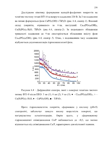 титану ВТ1-0 після ПЕО: 3 хв (1), 6 хв (2), 9 хв (3); ● – Ca10(PO4)6(OH)2, ○ –