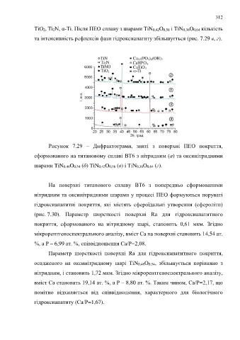 та інтенсивність рефлексів фази гідроксиапатиту збільшується (рис. 7.29 в, г).