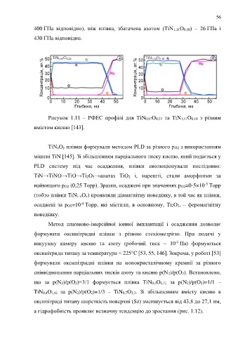 400 ГПа відповідно), ніж плівка, збагачена азотом (TiN1,11O0,10) – 26 ГПа і